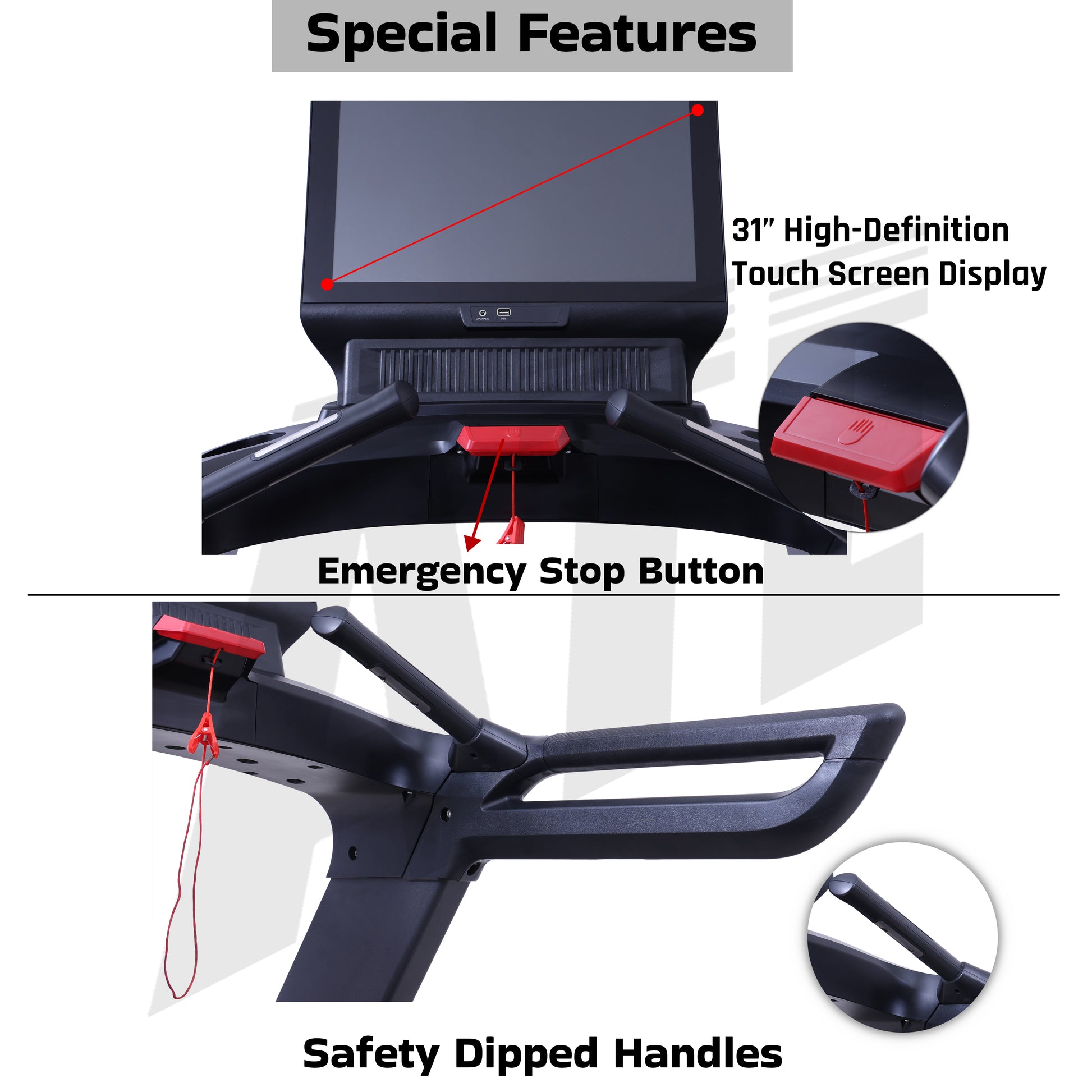 Interactive Android Touch Screen Display: The ATE Treadmill X8 Pro is equipped with an Extremely Large 31" High Definition 2160P Touch Screen display running on a native version of the Android Operating System making the ATE Treadmill X8 Pro a smarter machine then the competition! The X8 Pro is WiFi enabled and can connect to any WiFi network, features a Built-In Crystal Clear Speaker System, supports USB + AUX Connectivity and can connect to your mobile phone/earphones via Bluetooth.